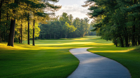 An empty golf course with a winding cart path, surrounded by tall trees and calm, peaceful surroundings.