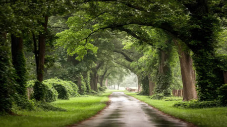 A beautiful view of a long path or driveway lined with lush green trees creating a natural canopy. The road leads into the distance, creating a sense of journey and tranquility.