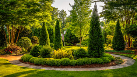 Tranquil garden scene with vibrant foliage surrounding a winding circular path, inviting moments of relaxation and outdoor reflection amid nature's beauty.