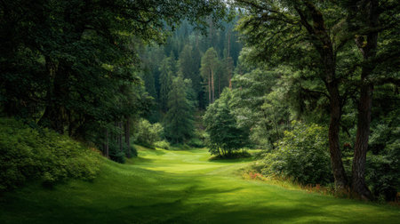 A serene golf course surrounded by lush greenery and tall trees. The fairways are meticulously maintained, with neatly trimmed grass.