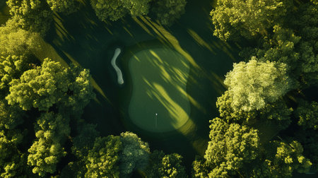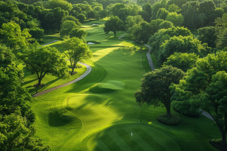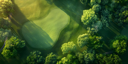 Aerial view of a lush golf course with varying shades of green and manicured fairways. AI generated.