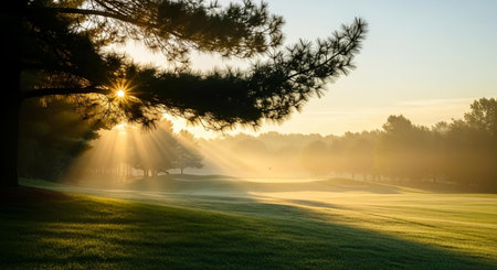 A tranquil sunrise scene over a lush golf course, with soft mist rising and sunlight casting gentle glimmers. Perfect for relaxation and nature appreciation.