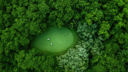 This aerial view captures a serene golf course nestled among dense tropical trees, showcasing lush greenery and the beauty of nature. Perfect for sports lovers.