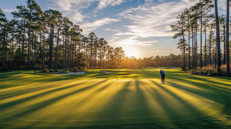 A serene image of a golf course at sunrise, with the morning light casting long shadows on the well-manicured greens and a lone golfer lining up a putt.
