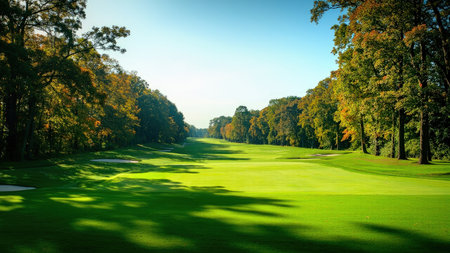 Capture the beauty of a meticulously manicured golf course in its prime. This scenic vista showcases a verdant green fairway flanked by majestic trees ablaze with autumn foliage. Bathed in warm sunlight under a clear sky, the image embodies the tranquility and recreational appeal of a perfect day on the course. Ideal for travel promotions, golf-related websites, or showcasing the beauty of nature and outdoors, this image evokes a sense of leisure and is perfect for illustrating any sport or tournament.