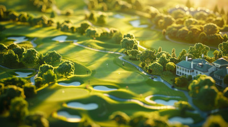 Drone shot of a sprawling golf course with rich green tones and well-kept gardens. AI generated.