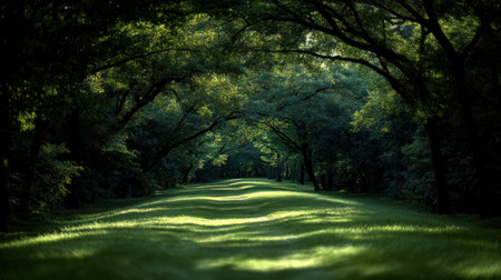 Sunlight filters through trees, casting gentle shadows on a serene green trail.