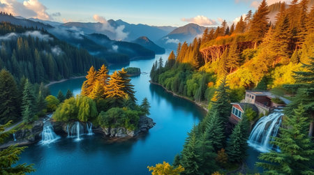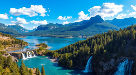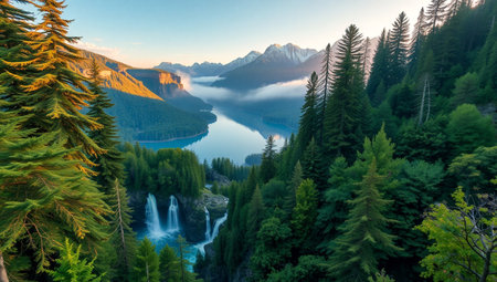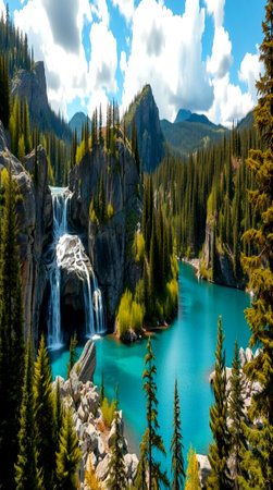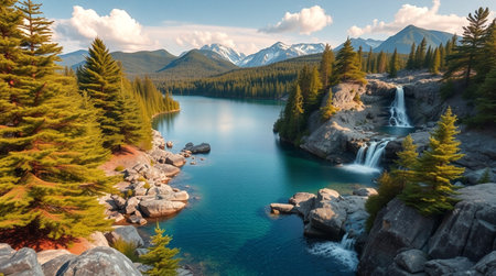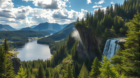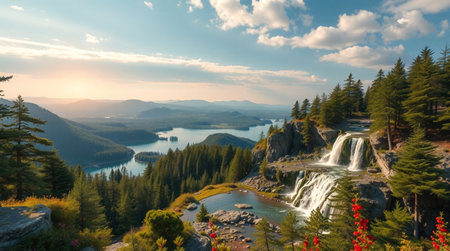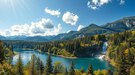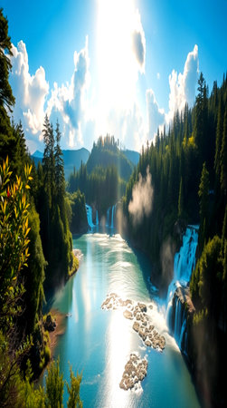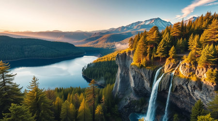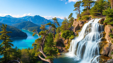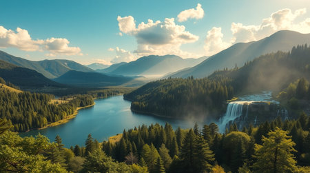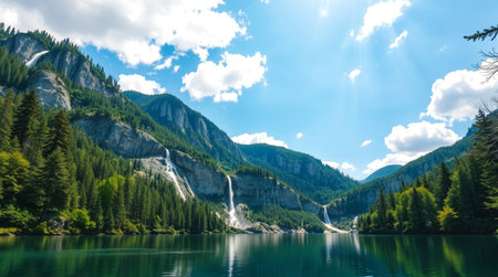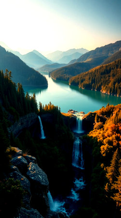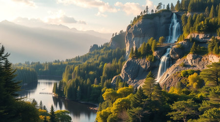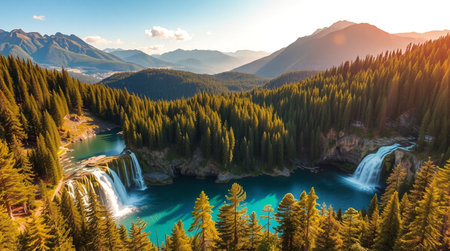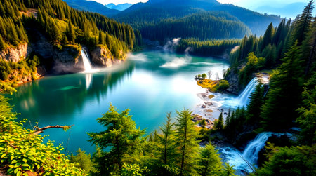 AI-generated Majestic cascading waterfalls plunge into a turquoise alpine lake surrounded by steep, pine-covered cliffs and mountains, dramatically illuminated by sun rays breaking through the mist in remote wilderness.
