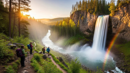 A group of hikers stand near a waterfall, enjoying a scenic view of a river and forested landscape. The image showcases vibrant colors, with sunlight casting an atmospheric glow. The composition highlights natural elements, potentially suitable for promotional or editorial purposes, conveying a sense of adventure and exploration in a natural setting.