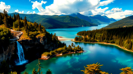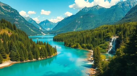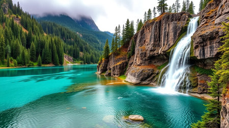Fantastic mountain landscape with turquoise lake and high waterfall