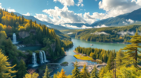 Panoramic view of turquoise lake with waterfall in autumn.