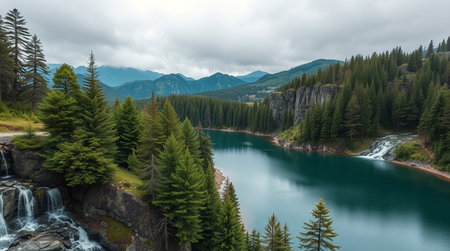 A serene lake nestled among lush pine trees and majestic mountains, creating a tranquil atmosphere. The calm water reflects the cloudy sky, inviting nature lovers to explore.