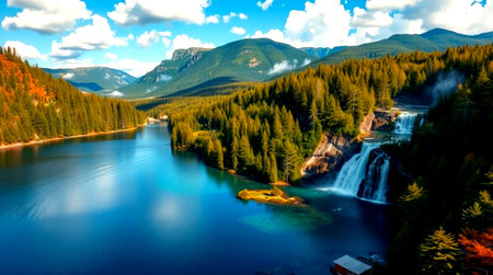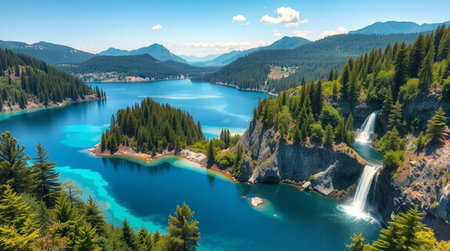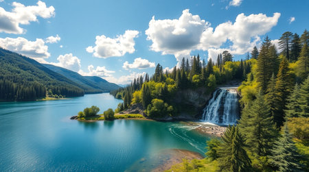 Aerial view of a beautiful mountain lake with a waterfall in the background
