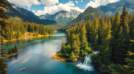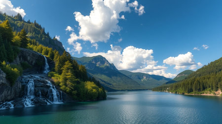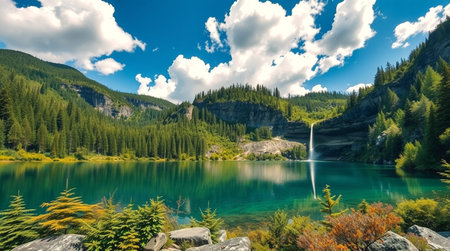Panoramic view of beautiful alpine lake with waterfall in mountains