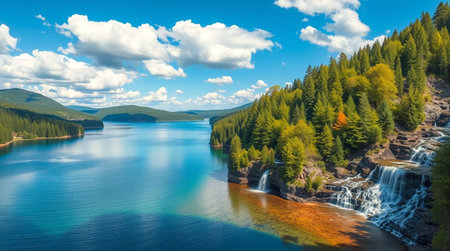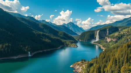 Aerial view of a beautiful lake and waterfall in the mountains.