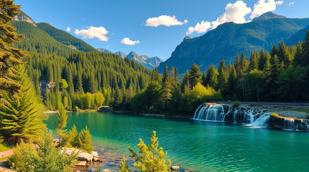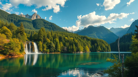 Beautiful mountain lake with a waterfall in the middle of the forest