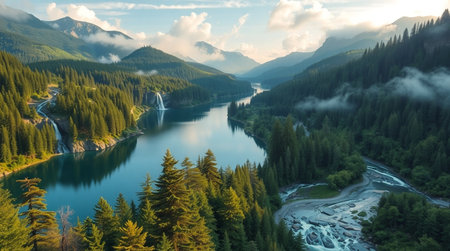 Serene mountain river flowing through evergreen forests at sunrise