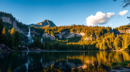 Serene mountain lake reflecting dawn light with waterfall foreground