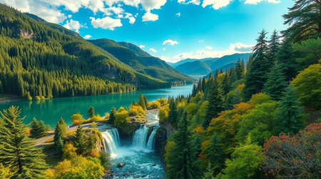 Mountain lake in the autumn. Landscape with a waterfall.