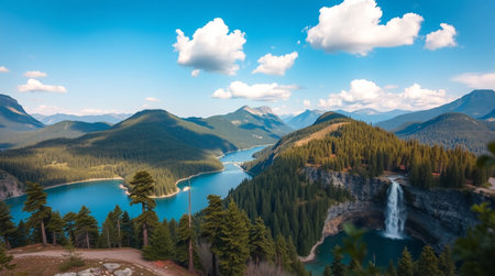 Panoramic view of the lake and waterfall in the mountains.