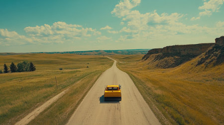 A vibrant yellow truck drives along an empty road, showcasing the beauty of nature with rolling hills and a clear blue sky filled with fluffy clouds.