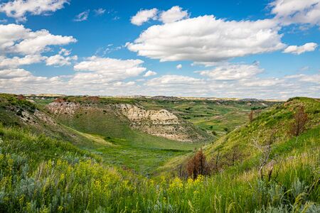 Wildflowers and green summer grass dominate the landscape in the South Unit of Theodore Roosevelt National Park near Medora, North Dakota.