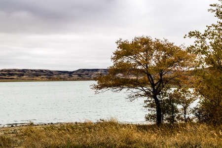 Panorama of the wide open prairie and grasslands in the American Midwest of North Dakota. This is in the Upper Souris National Wildlife Refuge during the fall.