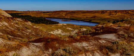 A panoramic view of River Bend Overlook at the North Unit of Theodore Roosevelt National Park in North Dakota.