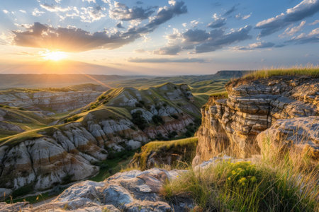 A breathtaking desert landscape at sunset with rugged rock formations and green grass