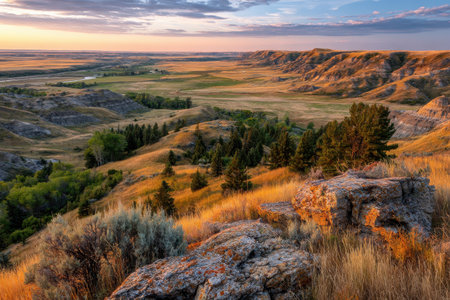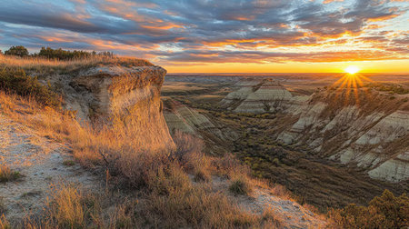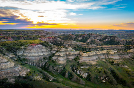 Scenic aerial view near Theodore Roosevelt National Park showcasing colorful Canyons at sunset sun