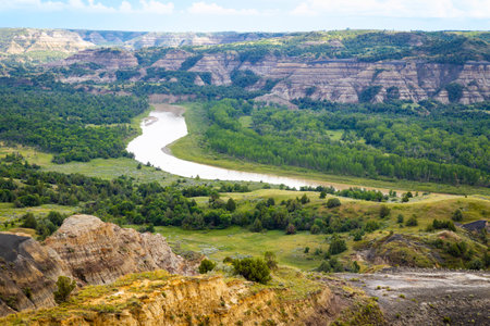 A sweeping panoramic view from the River Bend Overlook Trail in Theodore Roosevelt National Park captures the majestic Missouri vista