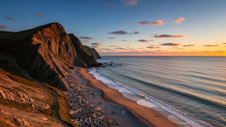 Stunning sunset over a rugged coastline. Dramatic waves crash against dark rocks.