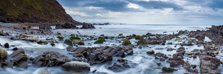 Panoramic shot of Porth-cadjack Cove in sunset light near Portreath on the North Cliffs coast of Cornwall England UK Europe