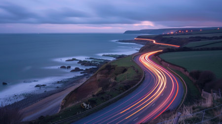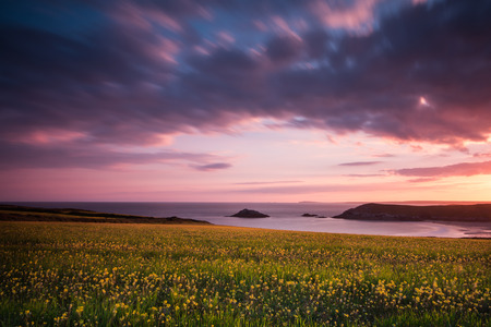Idylli wild flowers meadow on Cornish cliff at dramatic sunrise, motion blur of clouds