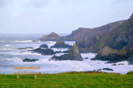 Bench on a clifftop overlooking a rocky coastline.