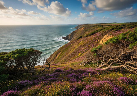 Panoramic view of the cliffs and wildflowers along the Atlantic Ocean in Brittany, France