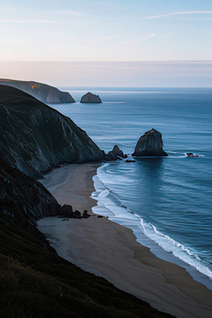 Dawn over the green cliff over the ocean. Camino de Santiago.