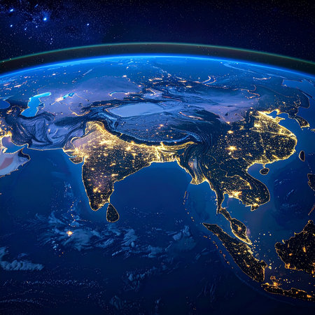 Stunning Aerial View of Asia at Night Captured from Space Highlighting Bright City Lights, Geography, and Natural Landscapes Beneath a Starry Sky