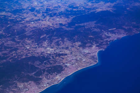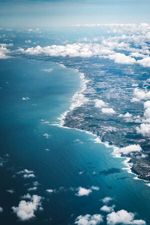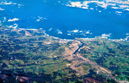 Flight over the coast of Portugal Lissabon region . Aerial view through the airplane window with clouds water and coastline.