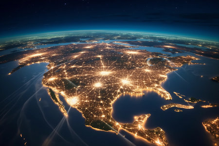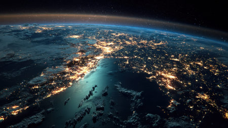 Earth from space at night, showing illuminated continents and starry sky. Clear details and vibrant colors en...