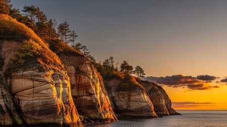 A dramatic coastal landscape bathed in the warm glow of golden hour. Layered sandstone cliffs rise majestically from the calm sea, their textured surfaces highlighted by the low-angled sunlight. Patches of green vegetation and scattered pine trees cling to the cliff tops, adding a touch of life to the rugged terrain. The sky transitions from a soft grey to a vibrant orange and yellow as the sun dips towards the horizon, casting a warm, serene ambiance over the scene. Small clouds catch the...