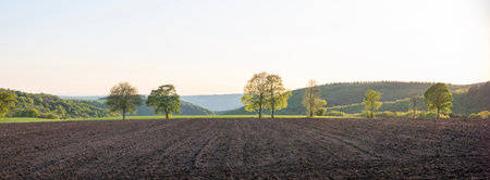 Beautiful rural landscape with trees and fields in golden sunlight at sunset, Eifel, Germany