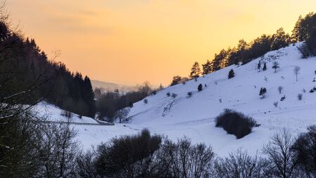 Cold snowy winter sunset in Bavaria, Germany. Sweet Solitude. White and Lonely hill Landscape. Lovely orange sunset