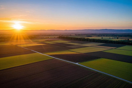 aerial view of agricultural fields on sunset, europe
