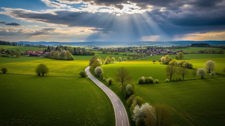 An aerial view captures a winding road through vibrant green rolling hills and meadows, with dramatic sunbeams piercing through a cloudy sky over distant villages.