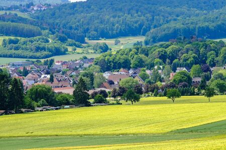 View on the agricultural fields with various types of grain in Bad Pyrmont, Germany.