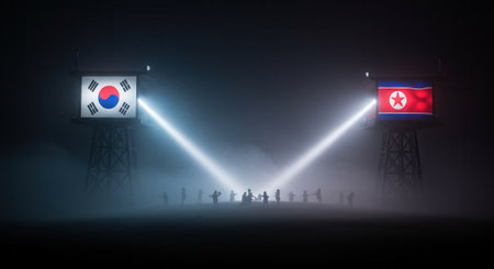 Futuristic DMZ scene with watchtowers displaying the South Korean and North Korean flags, emitting beams of light over a group of people in a foggy landscape.