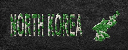 North Korea white text word on black cover. Text word crossword. Alphabet letter blocks game texture background.