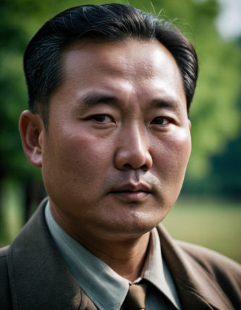 A middle-aged man from North Korea is depicted with a serious expression, dressed in formal attire, within an interior space that reflects the culture and environment of the region.