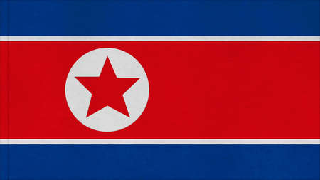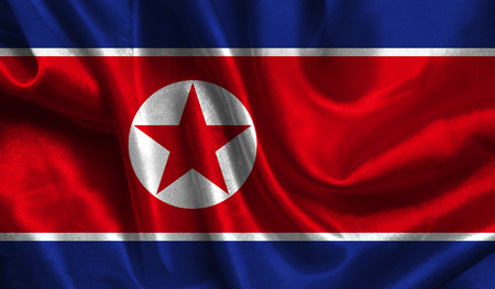 Fabric flag of North Korea. Crease of North Korean flag background, horizontal red white and blue, red star within a white circle.